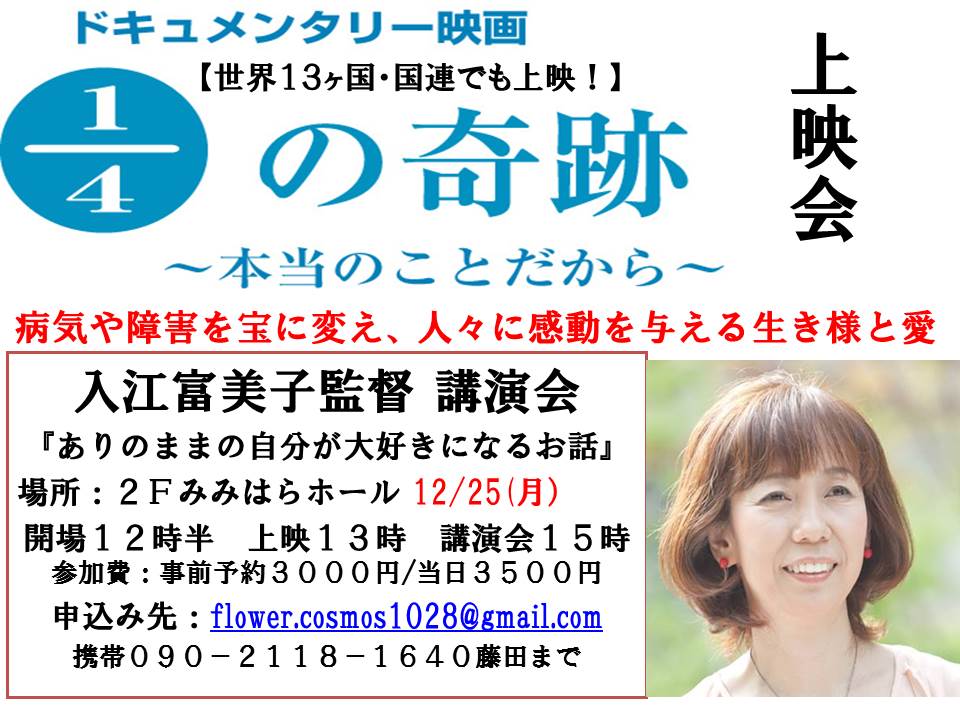 〇日時:12月25日(月)開場12:30/上映13:00/講演会15:00 〇参加費:事前予約3,000円/当日3,500円 〇お申込み先:090-2118-1640(藤田さま) 〇会場:みみはらホール(当院隣接)