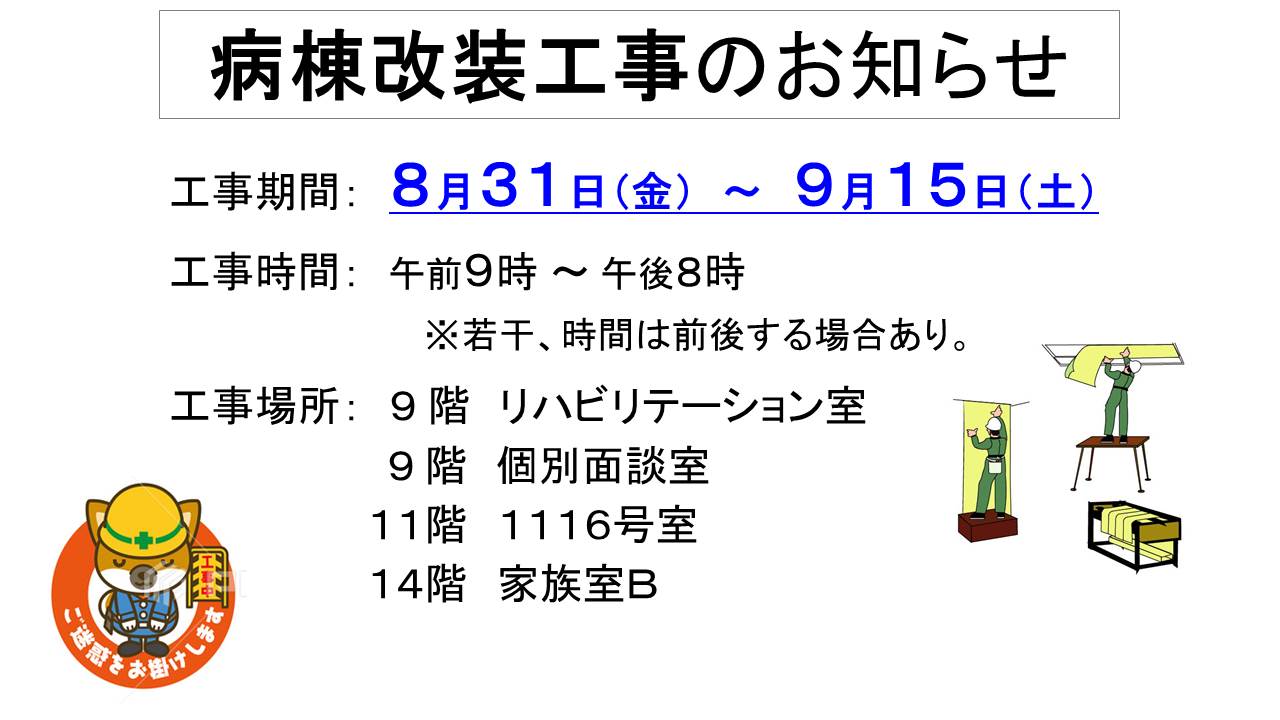 病棟改装工事のおしらせ 8/31(金)-9/15(土)