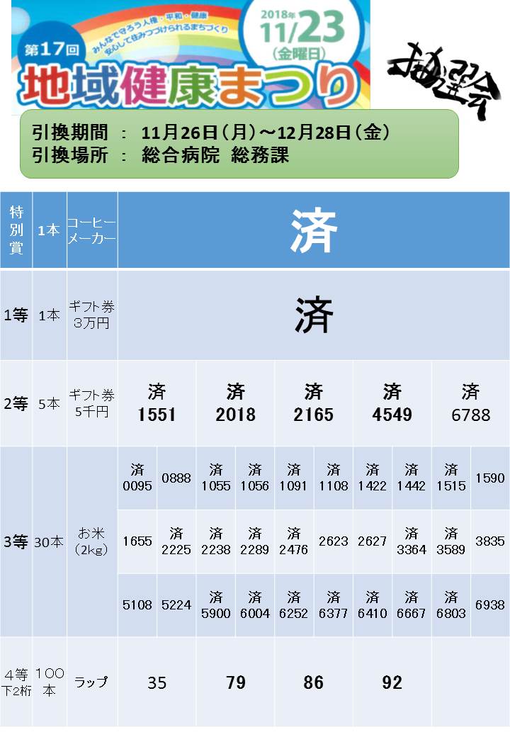 ご参加、ご協力ありがとうございました 当日発表しました、抽選券の当選番号は下記のとおりです お問い合わせ:耳原総合病院 総務課 (072-241-0501)