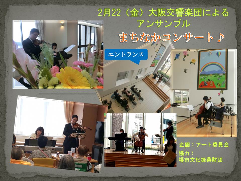 エントランスではチェロの豊かな響きが充満し、 病棟のデイルームではヴァイオリンとピアノの音色が 患者さまの指と気持ちを動かしていました。