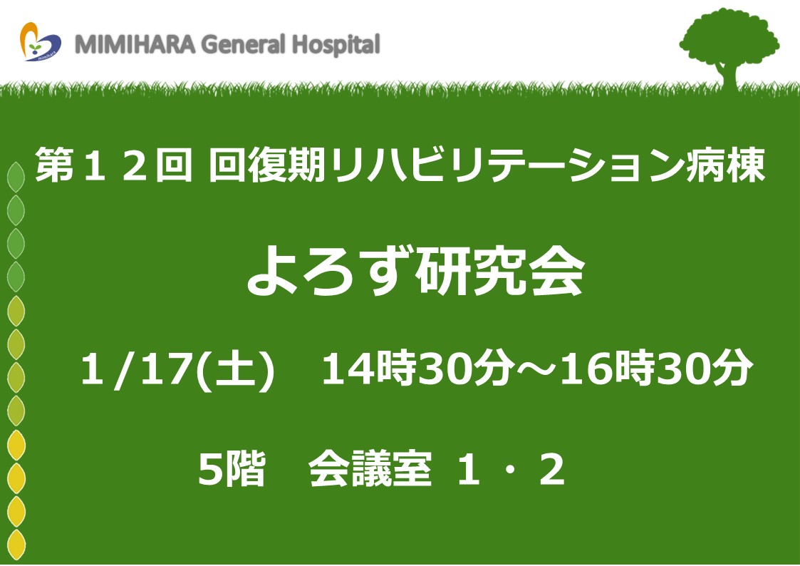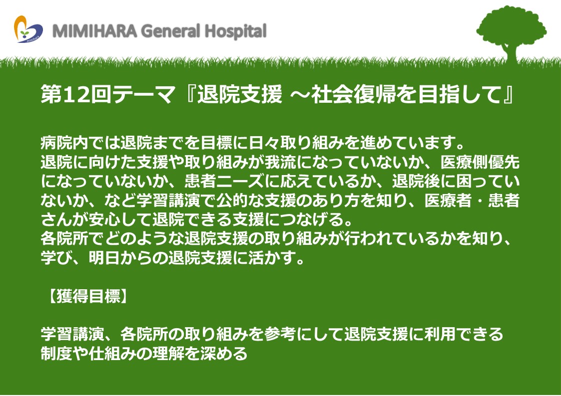 先日、当院にて「第12回よろず研究会」を開催しました。 今回のテーマは『退院支援 ~社会復帰を目指して~』です。