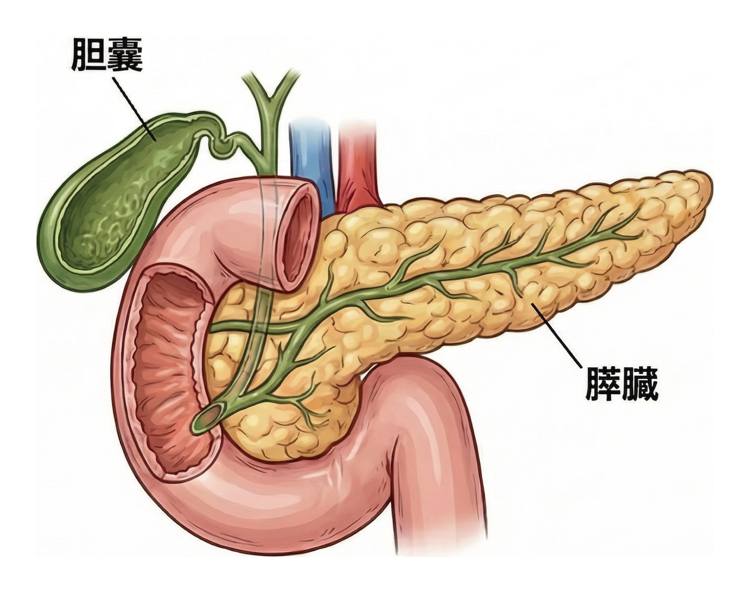 胆管は、肝臓で作られた「胆汁」という消化液を十二指腸まで運ぶ通り道です。胆汁は脂肪を消化するために欠かせない働きをしています。