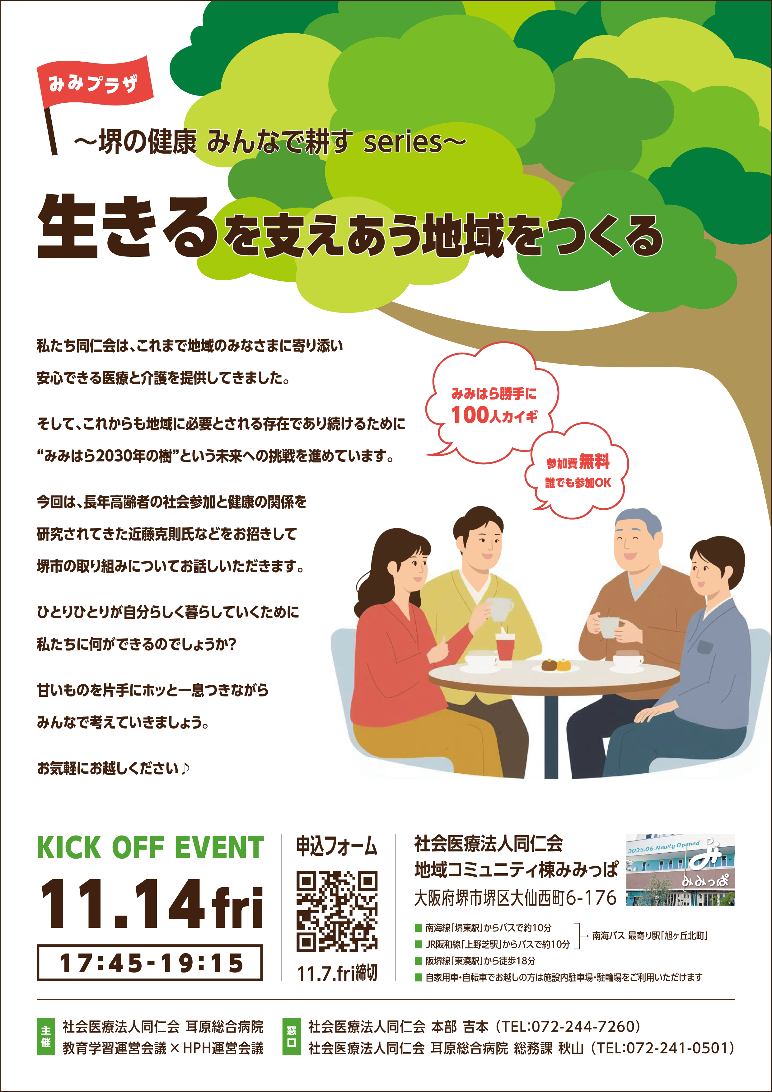 今回は、長年高齢者の社会参加と健康の関係を研究されてきた近藤克則氏などをお招きして、堺市の取り組みについてお話しいただきます。ひとりひとりが自分らしく暮らしていくために私たちに何ができるのでしょうか。甘いものを片手にホッと一息つきながら、みんなで考えていきましょう。お気軽にお越しください。