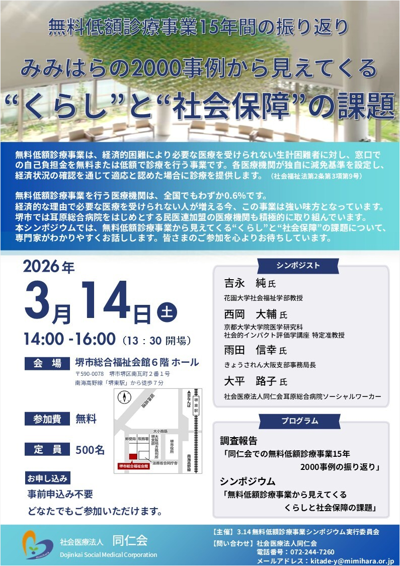 経済的な理由で必要な医療を受けられない人が増える今、この事業は強い味方となっています。堺市では耳原総合病院をはじめとする民医連加盟の医療機関も積極的に取り組んでいます。本シンポジウムでは、無料低額診療事業から見えてくる“くらし”と“社会保障”の課題について、専門家がわかりやすくお話しします。皆さまのご参加を心よりお待ちしています。