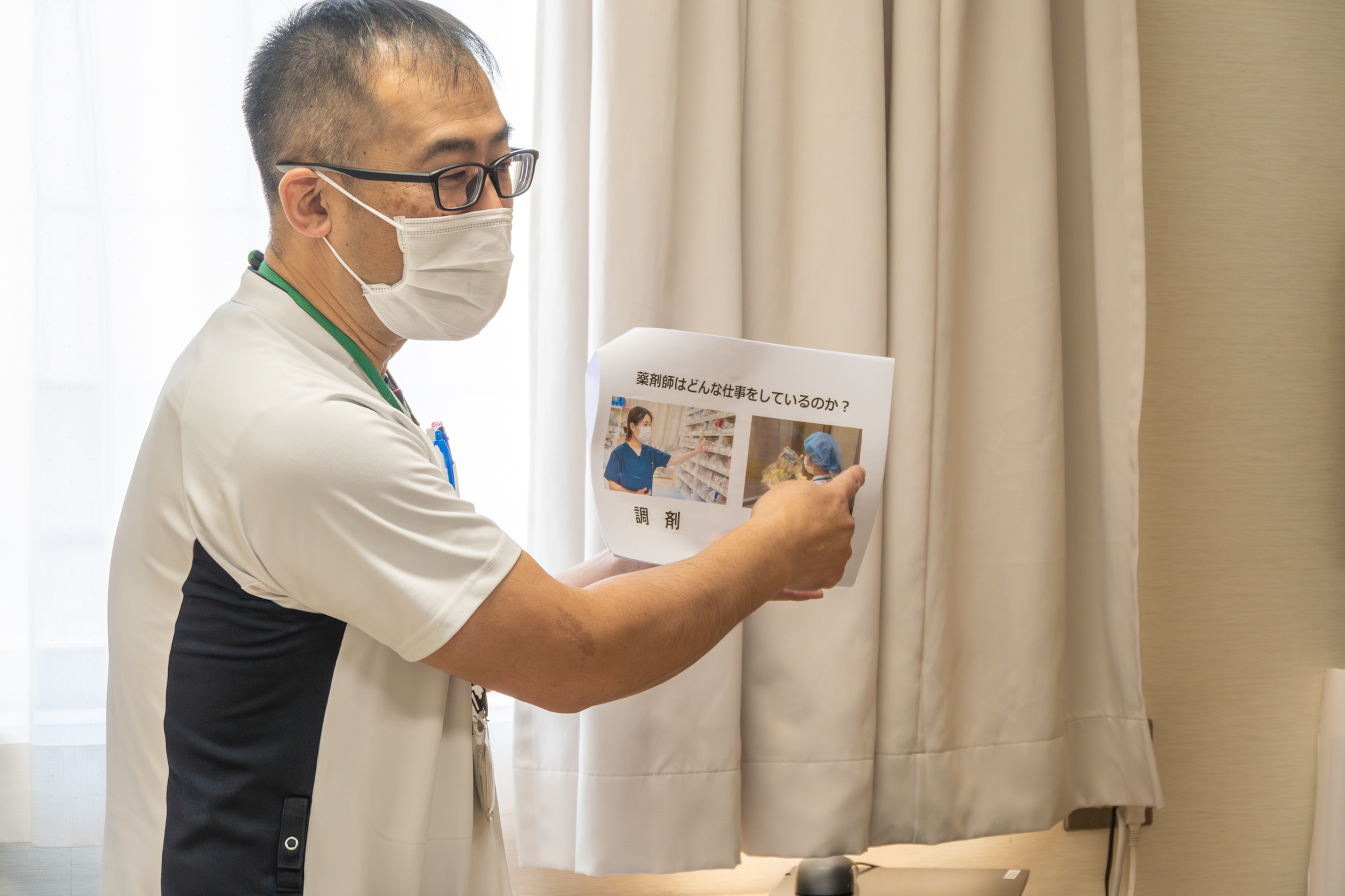 当日は、院内見学のほか、薬剤師・看護師の職場見学やインタビューを実施しました。インタビューでは「この仕事に就いたきっかけ」などの質問があり、対応した職員にとっても、医療の仕事を志した当初の思いをあらためて振り返る機会となりました。