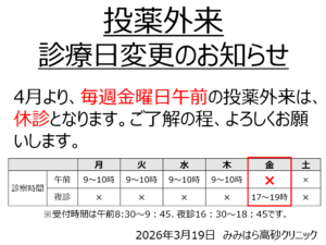 2026年4月より、毎週金曜日午前の投薬外来は